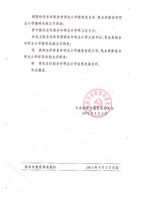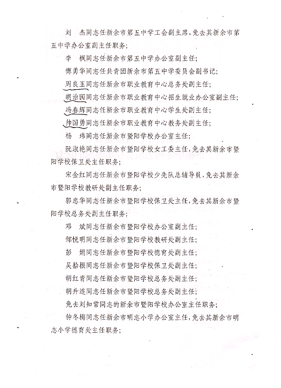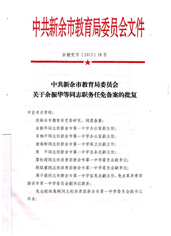 中共新余市教育局委员会关于余振华等同志职务任免备案的批复
