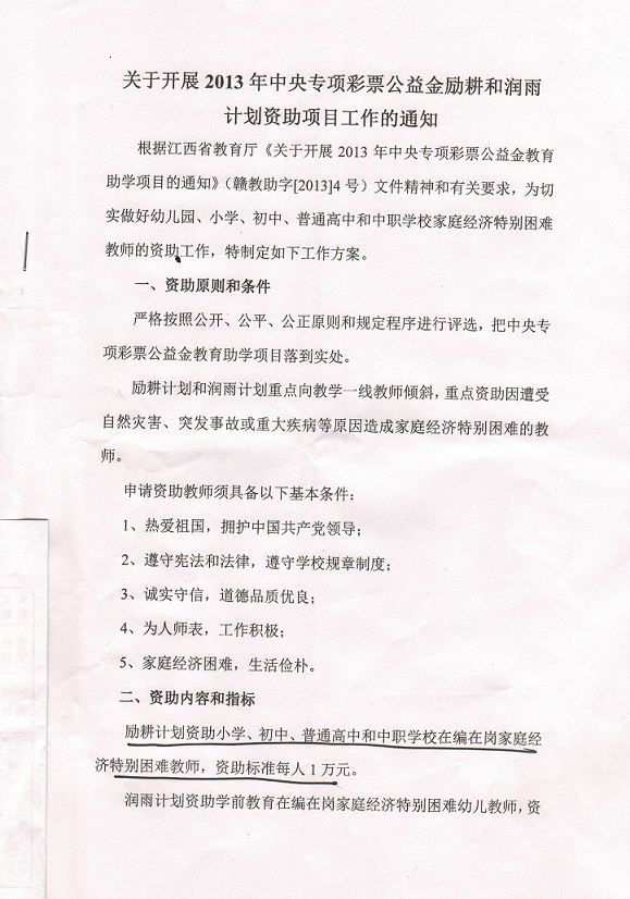 6、《中央专项彩票公益金滋蕙计划管理和实施暂行办法》、《中央专项彩票公益金励耕计划管理和实施暂行办法》和《家庭经济特别困难幼儿教师资助项目管理暂行办法》在教育网-信息公开-学生资助栏内下载。