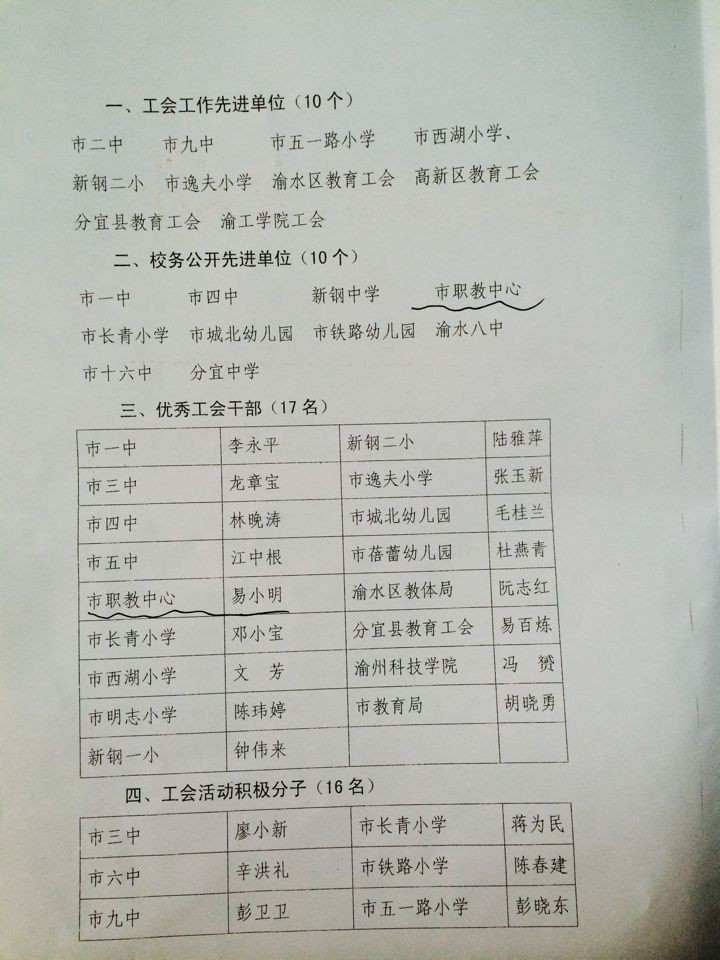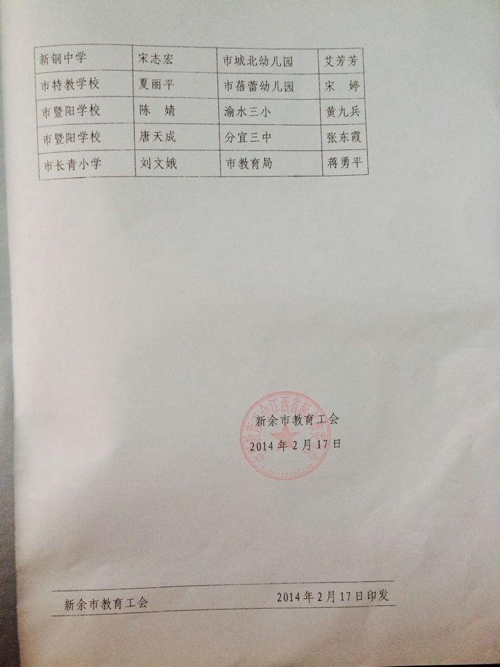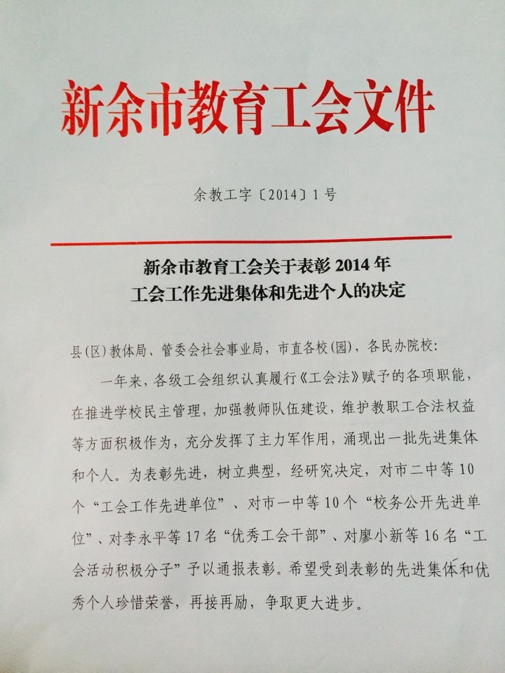 新余市教育工会关于表彰2014年工会工作先进集体和先进个人的决定