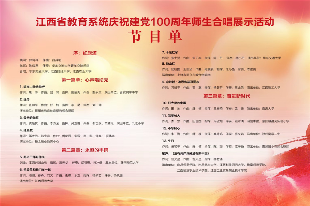 6月29日,由中共江西省委教育工委、江西省教育厅主办的“奋斗百年路 启航新征程”江西省教育系统庆祝建党100周年师生合唱展示活动在南昌圆满落幕。全省共有289支代表队参加省级活动,由我校教师李黎、廖玮嶷、傅玥三位老师指导的节目《斑鸠调》《八骏赞》荣获中学生乙组二等奖。经层层选拔,最终我校合唱团节目入选全省教育系统庆祝建党100年汇报音乐会13个节目之一,是新余市教育系统唯一入选节目,也是全省唯一一所中等职业学校入选节目。