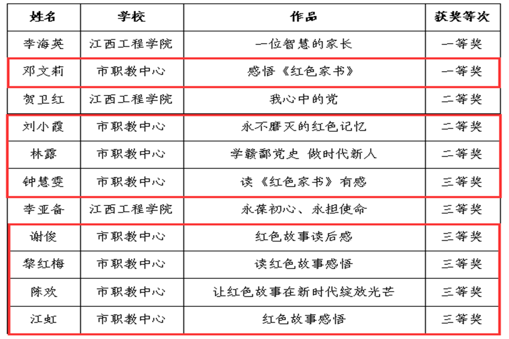 为进一步了解中国共产党百年光辉历程,学习革命先烈、英雄人物、先锋楷模的光荣事迹。市职教中心组织党员教师积极参加新余市教育系统举办的“感悟红色经典 献礼建党百年”征文竞赛活动,通过专家评审,有8位老师的作品脱颖而出,喜获佳绩。