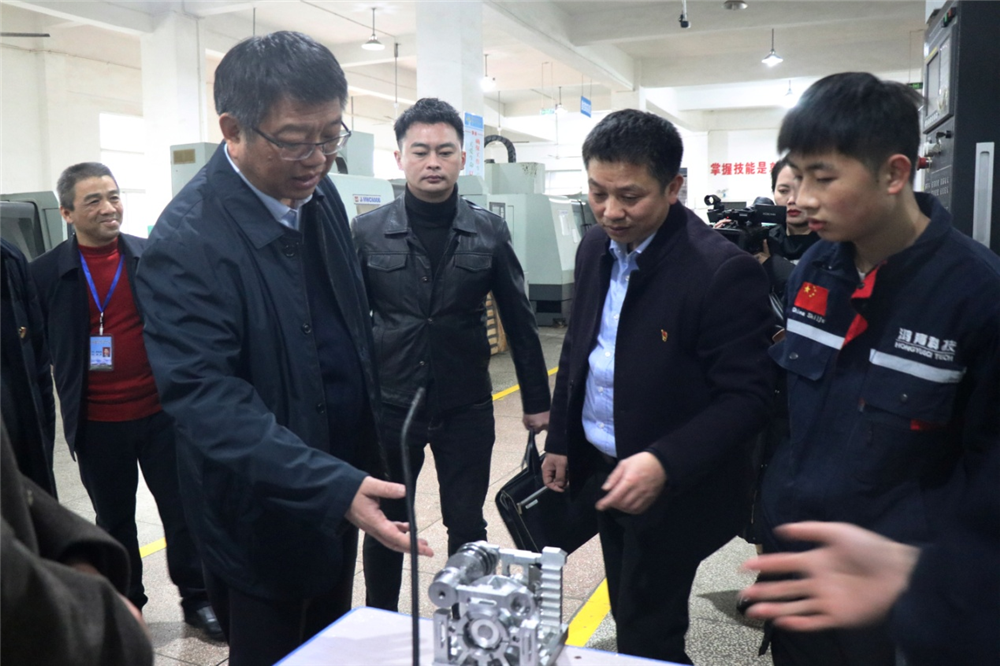 在数控实训基地,裴鸿卫副厅长饶有兴趣地现场观看了数控综合应用技能训练学生组装的训练作品抽水机装配运行情况,亲切与学生交谈,详细询问了抽水机工作原理、测试指标和加工方式,了解到整个机构的11个零件是由数控加工3人学生团队在6小时加工装配完成后,对学生娴熟的数控加工技能连连称赞说了不起,了解到学生中专毕业后有继续升学计划后,勉励他们抓住职教高考改革的大好机遇,提升学历层次,不忘职业教育初心,要做新时期知识型、技能型、创新型高技能人才,争做大国工匠。
