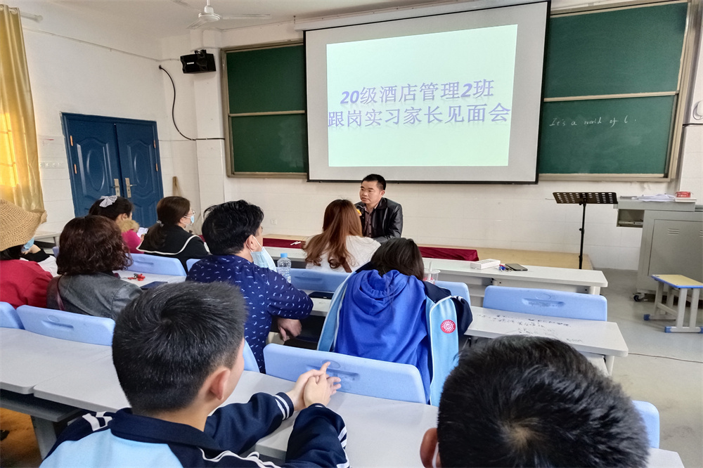 翌日3月9号下午16点30分,市职教中心召开了20级酒店管理2班家长见面会。会议在教学楼B栋201教室举行,分管校领导邹建峰、实习实验中心主任帅国勇、班主任廖丹以及2020级酒店管理2班家长们参加此会,并且要求学生们进行旁听。这次会议目的是向家长、学生们解释跟岗实习选择在天津鹏天阁酒店的原因,和进行该酒店的介绍;同时希望家长们要多和班主任交流,要学会放手,学生们才能快速成长;告诉学生们在鹏天阁酒店实习时要讲规矩,守纪律,长见识,学技能。