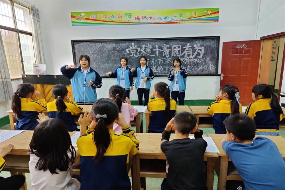 湖泽镇中心学校现有6个教学班级,在校学生155人,在职教师25人,无专职美育教师。校内建有一栋湖泽中心学校少年宫,少年宫内配备了音乐、美术、舞蹈、书法等6个教室。但是,因学校美育师资稀缺,少年宫美育教育活动不能正常化开展。为解决湖泽中心学校美育教育资源不足,盘活现有教学硬件资源,新余市职业教育中心与湖泽镇关工委、湖泽镇中心学校共建“党建+青团有为社会实践基地”。基地旨在发挥职教中心幼儿教育、工艺美术专业青年教师、团员青年的专业、技能优势,为学生提供奉献社会、展示技能的平台。每月第三周周五下午“青团有为帮教团”成员到湖泽中心学校给学生上音乐课、美术课、手工课等公益课程。