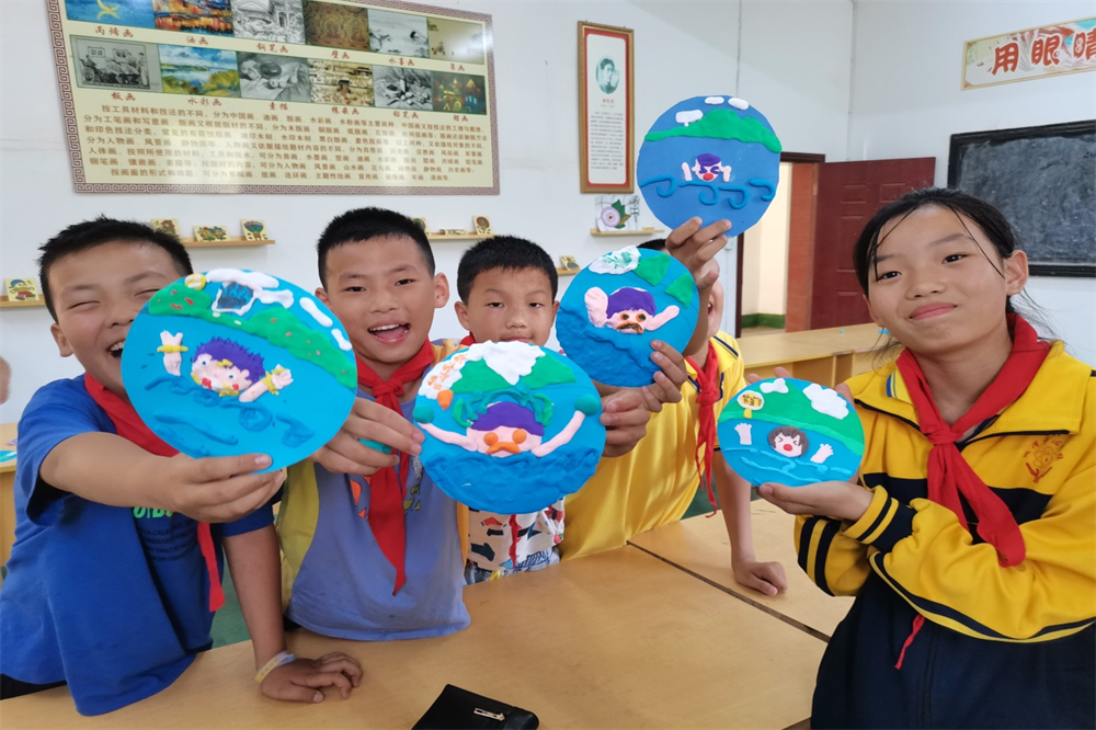 仪式后,与会人员观摩市职教中心的青年党员教师们为湖泽中心学校的学生上美术手工课与音乐课。在课堂上,湖泽镇中心学校同学们在陈欢老师的引导下共同制作自己的“防溺水”粘土画、刘江欣老师教授小朋友们演唱《孤勇者》手势歌。课程结束后,学生们的脸上洋溢着满足的笑容,簇拥着党员教师们展示着自己的课后成果。