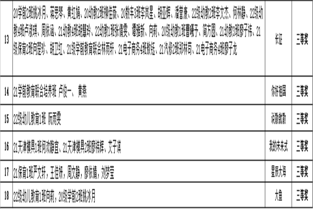 本届才艺大赛经过前期激烈的角逐,从50多个初赛节目中选拔出了18个节目参加总决赛。同学们用歌唱、舞蹈、朗诵、情景剧、相声等形式丰富的艺术形式诠释着对党的赞颂、对生活的热爱、对美的理解。比赛在舞蹈《画卷》动感的节奏中拉开帷幕,歌曲《如今的我们》展示了新时代青年的青春风采;情景剧《五四运动》演绎了中国共青团在党的指引下,披荆斩棘,奋勇前进的先进事迹;舞蹈《版纳印象》展现傣族独有的婀娜风情;幼儿舞蹈《小鸡出没》把童年时代的欢声笑语演绎的淋漓尽致。精彩的表演赢得现场观众阵阵掌声,呈现出当代中学生热爱艺术,追求真善美的精神风貌。本次大赛名次如下: