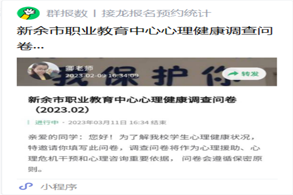 为进一步加强未成年人的心理健康教育,推进学校心理健康教育工作的开展,营造良好的互助关爱校园氛围,使全体学生科学地认识健康心理指标、了解心理健康知识,掌握必要的心理调适方法,形成正确的心理健康观念,以积极向上的阳光心态面对学习与生活,营造积极向上、健康和谐的校园文化氛围。开学初,新余市职业教育中心开展了以“新学期,‘心’测量”为主题的全员心理健康普查,此次心理健康状况摸排釆取电子问卷形式展开,问卷有效率为100%。经过系统的调查与分析,中职学生的心理健康隐患排在前三位的依次是学习压力、就业规划、心态情绪。