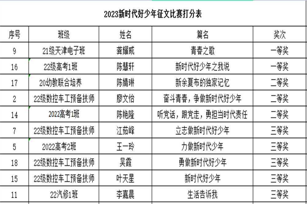 本着公平、公正、公开的评分原则,21级天津电子班龚耀威的《青春之歌》和22级高考1班陈慧轩的《新时代好少年之我说》获得了本次征文比赛一等奖。比赛结果如下: