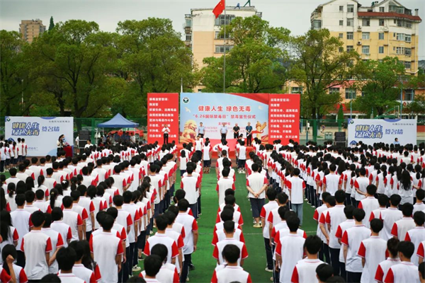 我宣誓:“珍爱生命,远离毒品。自觉抵制毒品侵蚀,坚决与毒品作斗争。不吸毒、不贩毒,不种毒、不制毒,洁身自爱,永不沾毒!”全体学生面向中国禁毒标识旗共同宣誓。铿锵有力的禁毒誓言响彻校园,震撼人心,坚定的声音表达了学生对抵制毒品的信心和决心。