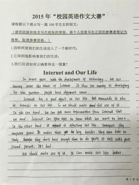 为了丰富同学们的校园文化生活,营造浓厚的校园英语学习氛围,提高广大学生的英语写作水平,为学生提供展示自我、激励他人的平台, 2015年5月13日下午,基础教研室在学校七楼多媒体教室举行了一次校园英语作文大赛。本次比赛参赛学生达60多人,经我校英语老师的认真评选,共有18名优秀选手脱颖而出。