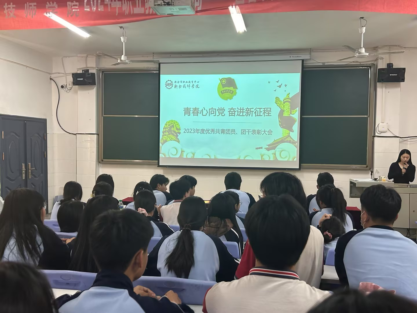 为弘扬五四精神,传递榜样力量,激发青年师生实干担当热情,5月14日,市职教中心团委在北湖校区团校举行“青春心向党 奋进新征程”2023年度五四表彰大会。大会由团委委员刘江欣主持,校团委书记黄裕嘉、团委委员姚如意、章懿清以及新老团员代表参加了此次大会。
