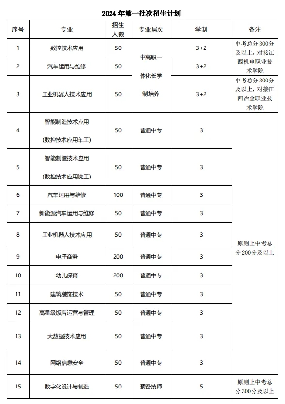 学校招生分为两个批次。第一批次招生专业为中高职一体化长学制培养(3+2)、省内高考班、高级技工班及预备技师班;第二批次招生专业为天津高考班,拟在普通高中录取分数线公布后发布招生公告,具体安排敬请关注新余市职业教育中心(新余技师学院)第二批次招生公告。