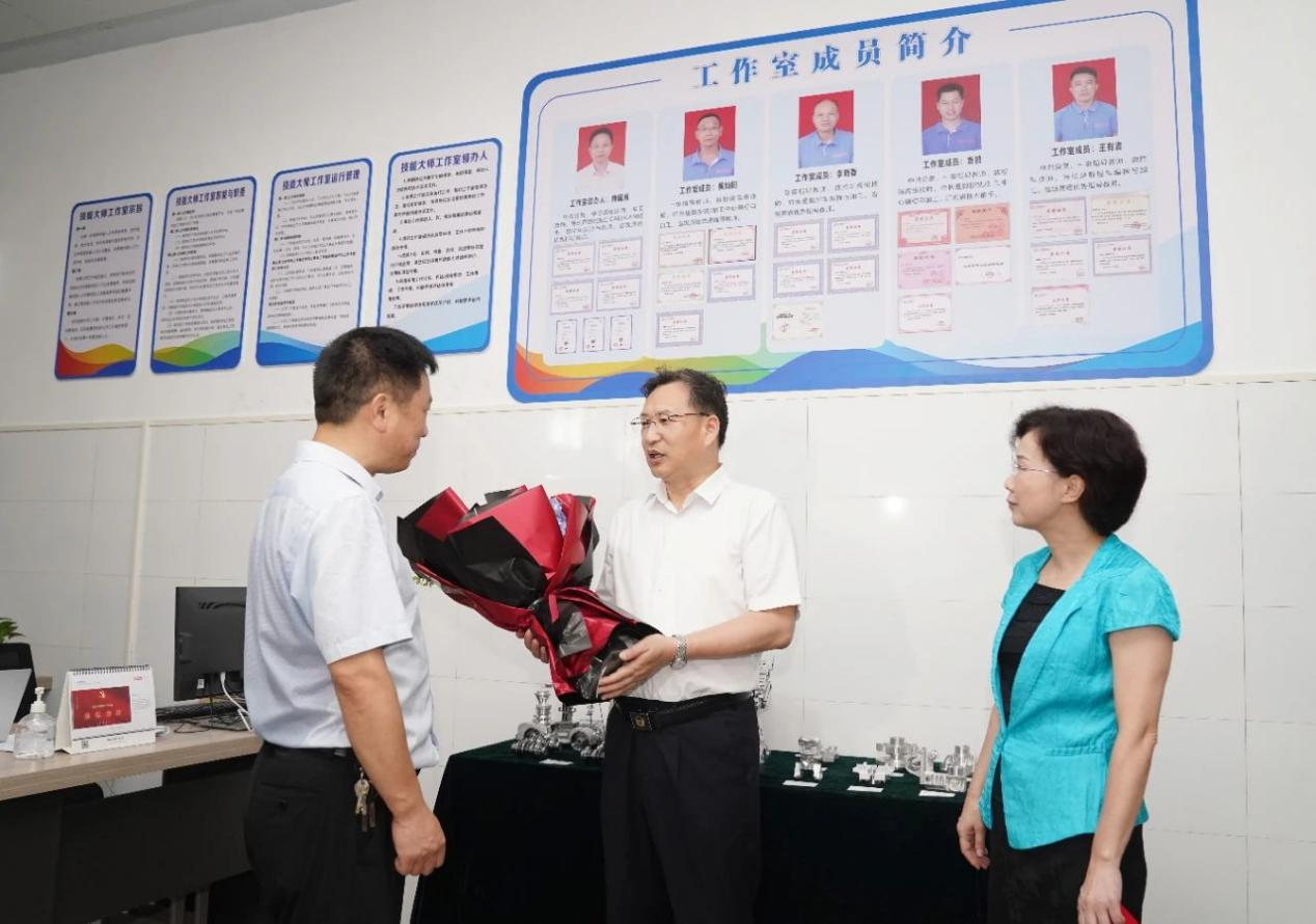 郑光泉书记一行首先参观了省数控加工技能大师工作室,并为教师代表帅国勇赠花和慰问金,鼓励帅国勇带领团队勇攀高峰、争创一流。并同现场实训学生亲切交谈,了解他们的学习、生活情况。