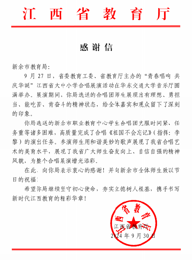 近日,江西省教育厅向新余市教育局发来感谢信。信中,江西省教育厅向新余市教育局传达了感谢之情,特别赞扬了市职教中心合唱团在“青春唱响,共庆华诞”全省合唱展演活动中的卓越表现。省教育厅指出,合唱团克服时间紧、任务重等诸多困难,高质量完成了合唱任务。参演师生用和谐美妙的歌声展现了出了合唱艺术的美育水平,展现出了广大师生奋发向上、自信自强的精神风貌。