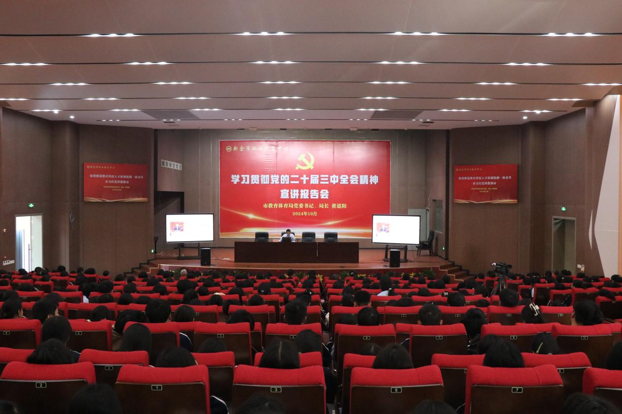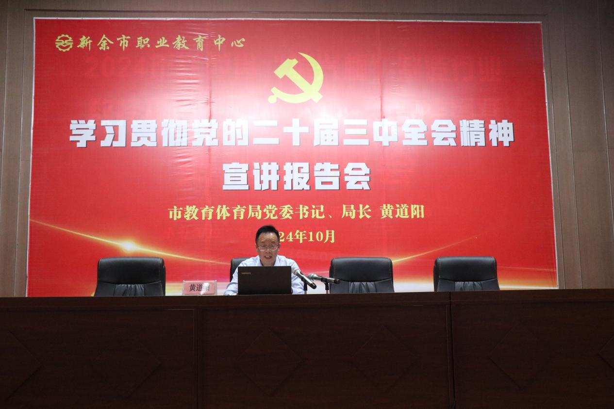 为深入学习贯彻党的二十届三中全会精神,引导广大师生深刻领会全会精神和丰富内涵。10月25日下午,市教体局党委书记、局长黄道阳同志到市职教中心开展党的二十届三中全会精神学习宣讲。校领导班子、中层以上干部、思政课教师及学生代表三百余人参加报告会。校党委书记胡浩然主持本次宣讲。