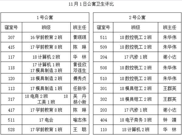 为进一步推进我校校园建设,营造良好校园学习、生活环境和氛围,强化班级文化建设,培养学生良好的学习生活习惯,强化学生的劳动意识、环保意识和责任意识。111日下午4:30,在学生处的组织下,学生处老师及部分班主任组成的评比小组对全校教室和寝室进行了一次大面积检查评比。活动中,所有班级认真打扫布置了教室、寝室。