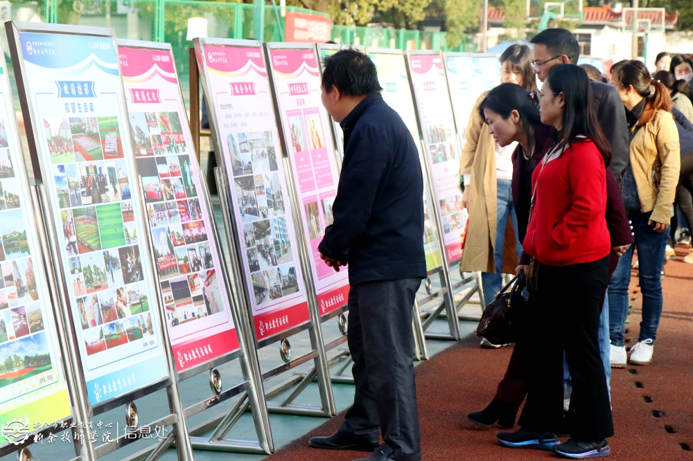图为教师向家长展示学生作品