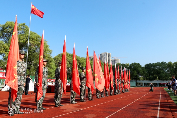 最后,新钢武装部军事科科长彭正东、校长刘焦华为各连队授旗,校长刘焦华宣布2018级新生军训开幕。九个连队随即奔赴指定训练场,开始为期5天的军训生活,期间将系统学习跨立、敬礼、齐步走及停止间转法等训练。