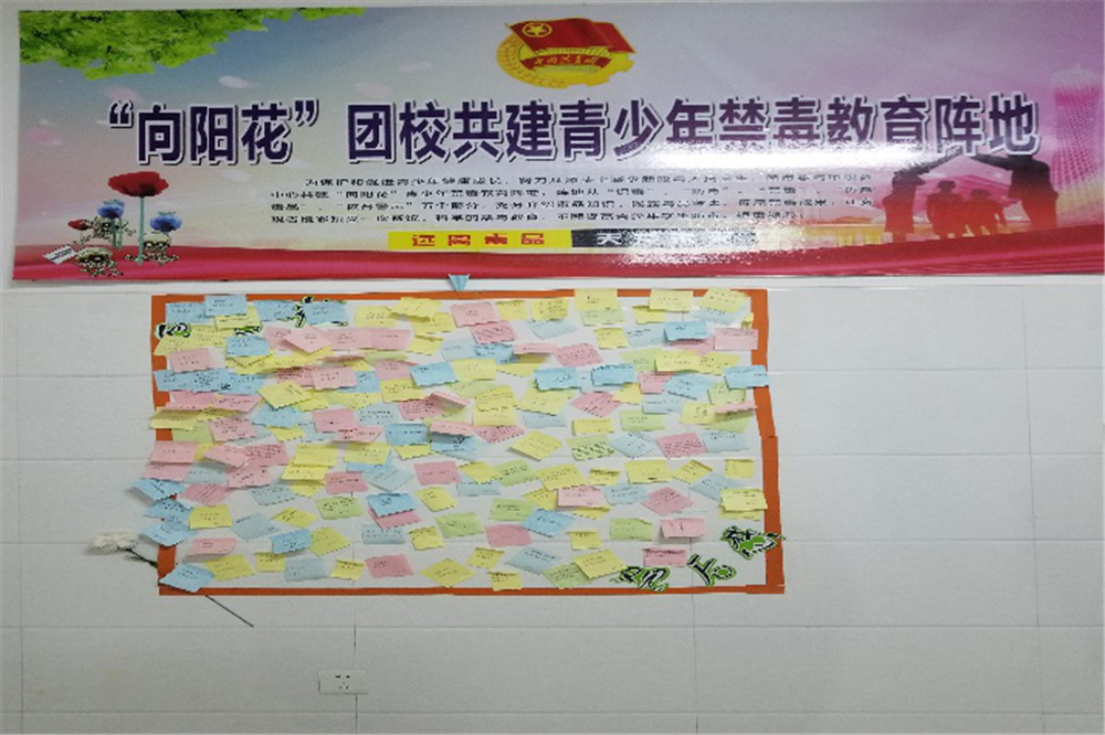 本次活动由20级秋季生参加,学生们在班主任的带领下有序进场完成了禁毒教育学习。来自校园广播站的讲解员向同学们介绍了毒品的概念和种类以及对人体的损害。通过讲事例,看图文,讲述了毒品给家庭、社会、国家造成的危害。在讲解员的引导下,同学们按指定路线完成了参观,在结束之际,讲解员给每位同学们发放了小纸条,让他们写下观后感并张贴在留言墙上。
