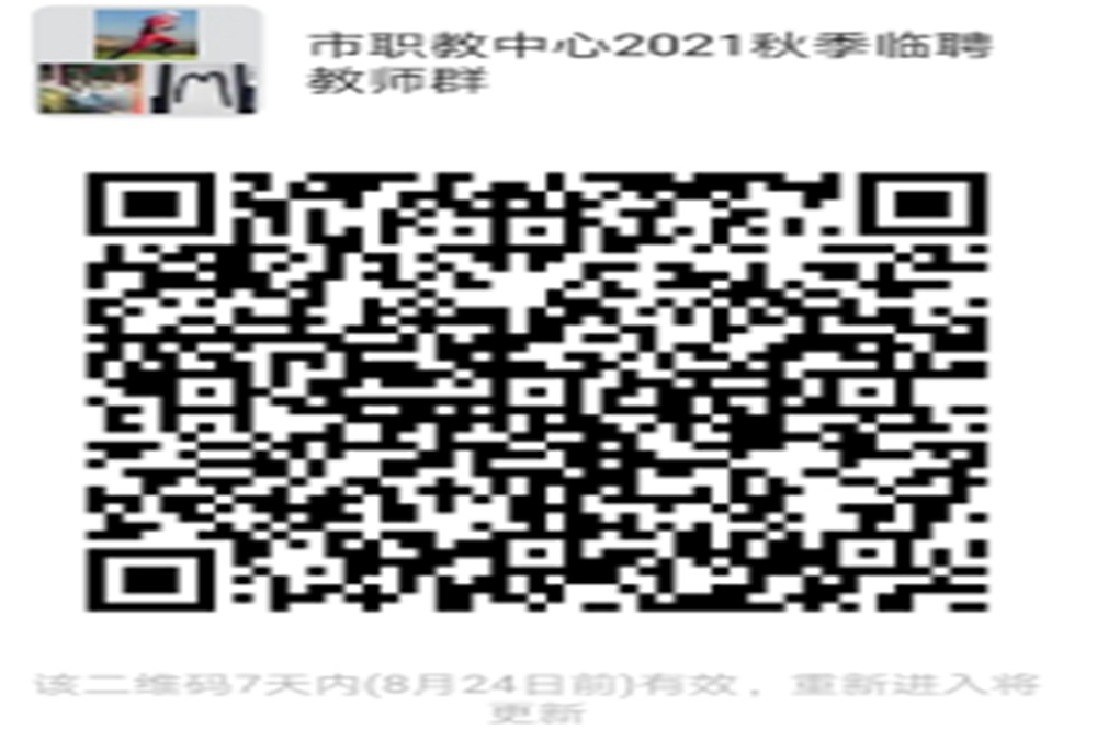 (市职教中心2021秋季临聘教师群。1、入群前必须填写报名表并发送到指定邮箱。2、加好友时请备注“2021秋季临聘+姓名+应聘专业”,否则不予通过)。