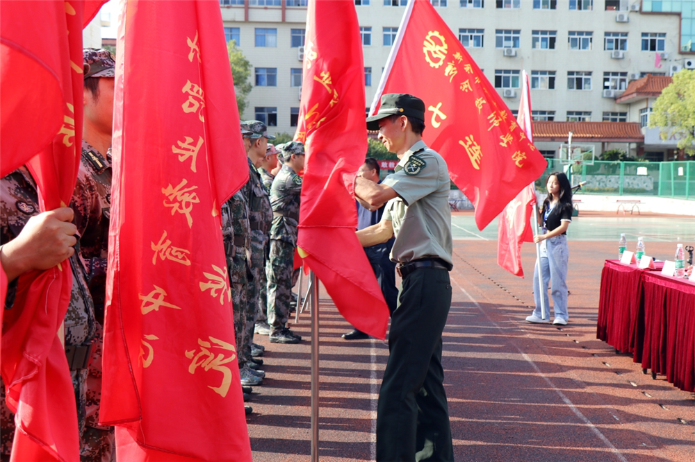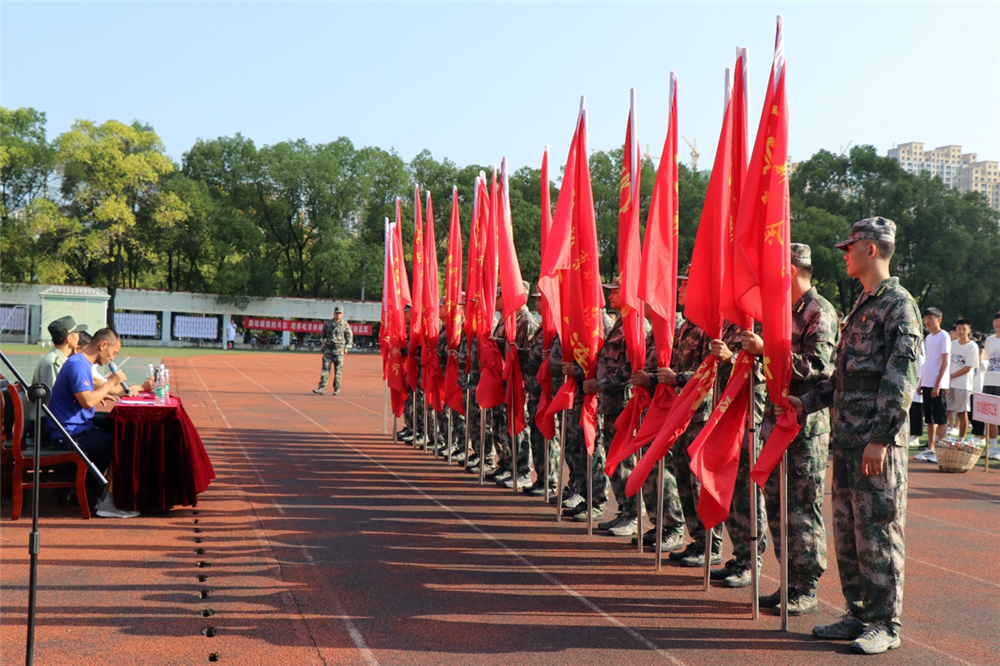 最后,校党委书记刘小图和新钢武装部军事科科长彭正东一起为各连队授旗。新钢武装部军事科科长彭正东讲话并宣布各连教官入列,校党委书记刘小图宣布2021新生军训开幕。38个班级共1800余名新生编为19个连队,开始为期12天的军训生活,期间将进行跨立、敬礼、齐步走及停止间转法等训练。