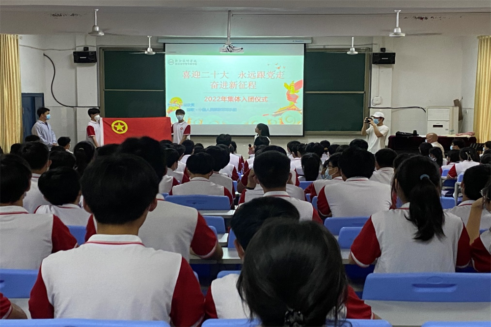 随着全体人员起立、奏唱国歌,新团员入团仪式正式拉开序幕。团委委员姚如意老师宣读了2022年149名新团员名单,接着副校长李峰和校团委书记林露给新团员颁发并佩戴团徽,在鲜艳的团旗前,团委委员张寒柏带着新团员庄严宣誓,全体新团员新团员们将右拳举起过肩,面对团旗庄严宣誓。坚定的目光和铮铮的誓言展现出了共青团员积极向上的活力和朝气。