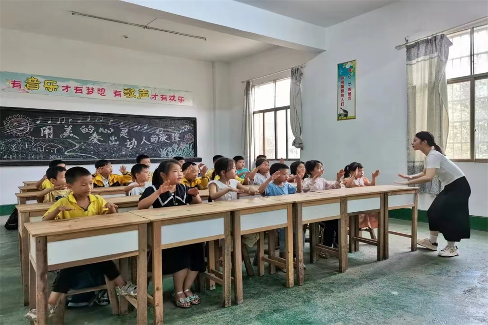 仪式后,与会人员观摩市职教中心的青年党员教师们为湖泽中心学校的学生上美术手工课与音乐课。在课堂上,湖泽镇中心学校同学们在陈欢老师的引导下共同制作自己的“防溺水”粘土画、刘江欣老师教授小朋友们演唱《孤勇者》手势歌。课程结束后,学生们的脸上洋溢着满足的笑容,簇拥着党员教师们展示着自己的课后成果。