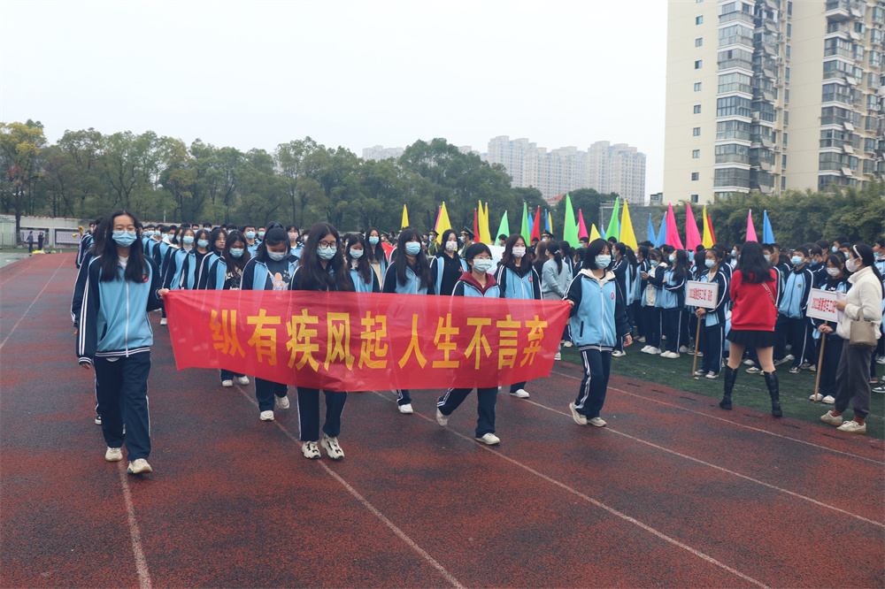 伴着催人奋进的旋律,踩着铿锵有力的节拍,国旗护卫队员拥护着鲜艳的五星红旗健步走入操场,彩旗队、会徽队气势豪迈经过主席台,向场边观众展示青春的风采。