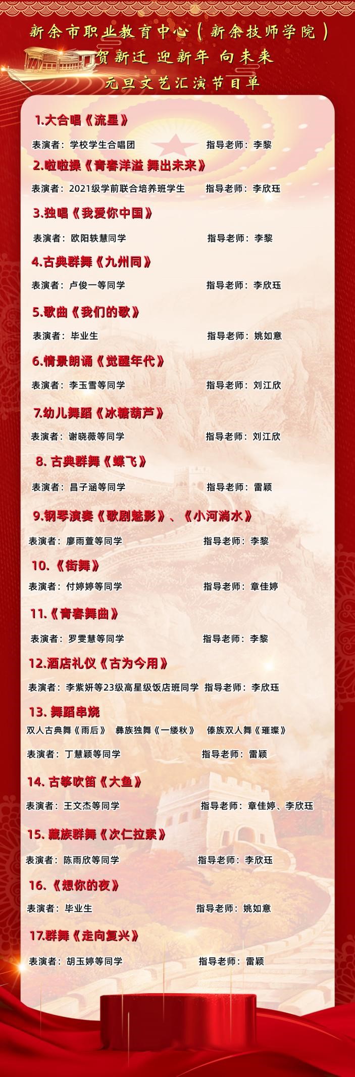 风劲帆满好起航,继往开来谱新篇。新余市职业教育中心(新余技师学院)在喜迎仙女湖校区新迁之际,向全体师生展示学校教育教学成果,诠释“崇德尚技、笃行臻善”的职教精神。2023年12月28日14:30分,“贺新迁 迎新年 向未来”文艺汇演将在学校仙女湖校区精彩上演,我们与全体师生共同描绘美好新时代,共同起航迎接2024年。