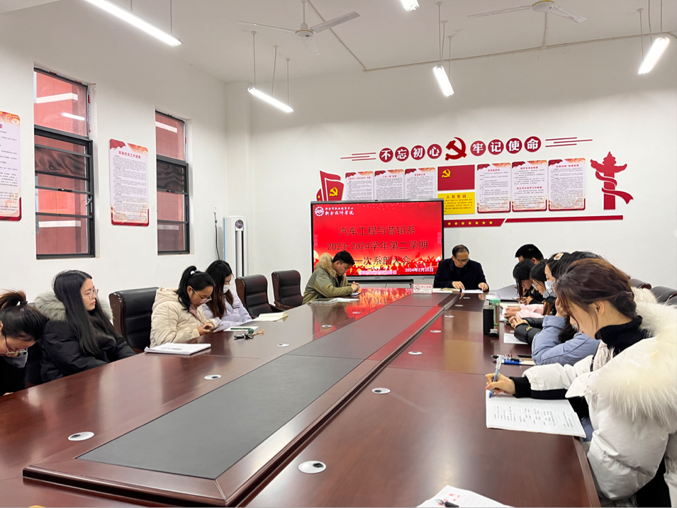 祥龙迎春,万象更新,充满希望与憧憬的新学期如期而至。为科学谋划新学期发展,确保开学工作平稳有序进行,2024年2月25日上午,市职教中心汽车工程与营销系在仙女湖校区4#207召开2023-2024学年第二学期第一次系部大会。会议由系部负责人康乐主持,校党委副书记、校长任凤生及系部全体教师与会。