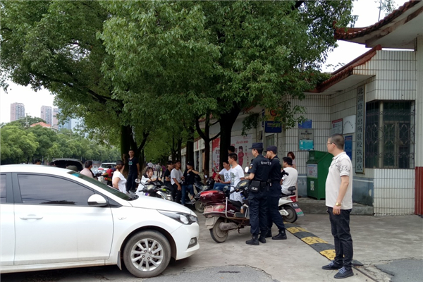 近日,为维持校园期末交通秩序,保障广大师生安全,在学校本学期期末考试最后一场结束的时间,保卫处早做准备,联系市特警大队和派出所民警到校协助校门交通秩序。早早就有大批住校学生家长开车来校接孩子、拿行李回家,虽然烈日当空,气温较高,市职教中心保卫处人员及学校保安冒着高温在学校校门维持、指挥交通秩序,确保了校门交通秩序和师生出行安全。